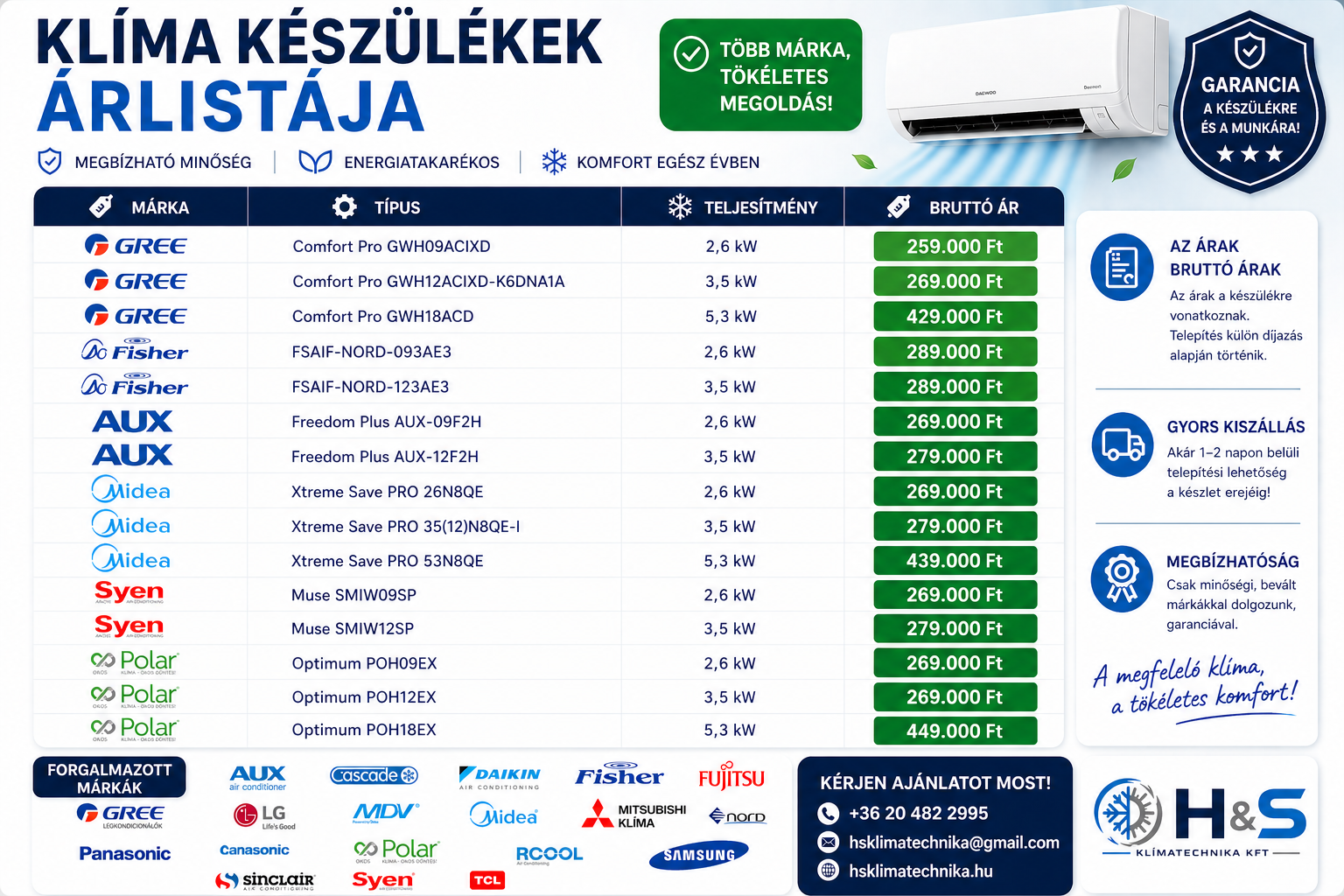 Érdeklődjön a +36204822995 telefonszámon, Whatsapp-on vagy e-mail: hsklimatechnika@gmail.com